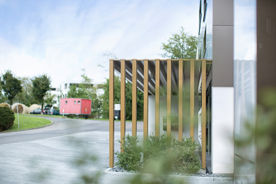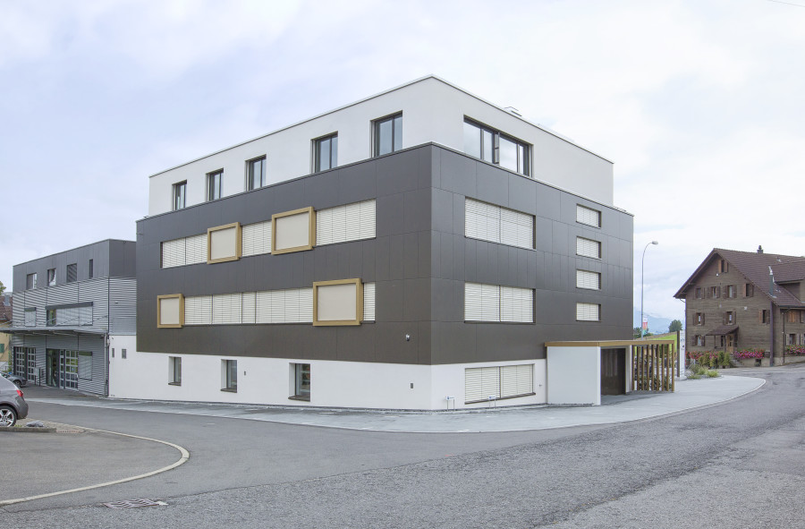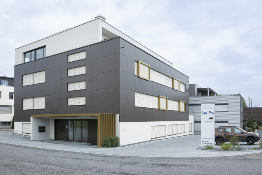 Der Erweiterungsbau für die LAN Pro AG schafft Platz für Produktion, Administration und eine Kantine; Herzstück ist ein zweigeschossiges, vollautomatisches Lagersystem, das den Materialfluss zur Fertigung sicherstellt. Tragwerk, Raumhöhen und Erschliessung sind auf diese Anlage abgestimmt, die Fassade interpretiert die firmeneigene Kabelproduktion in bronzefarbenen Elementen.