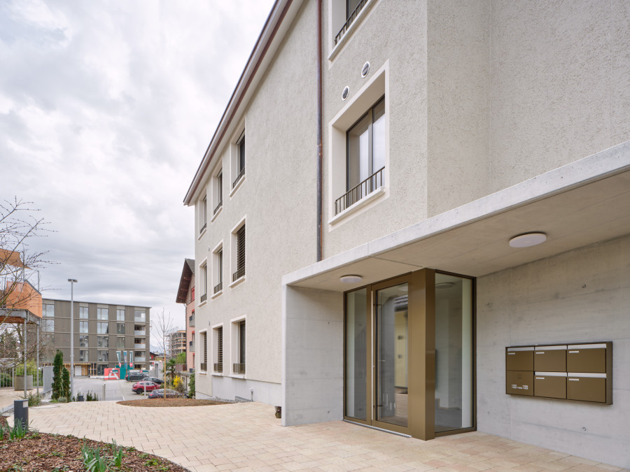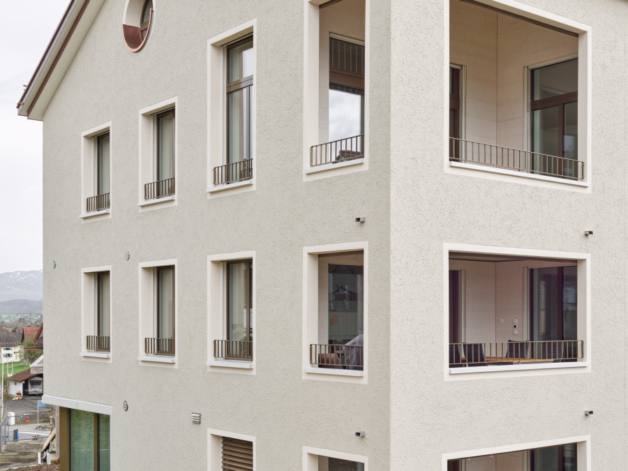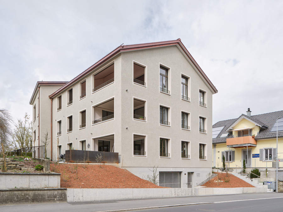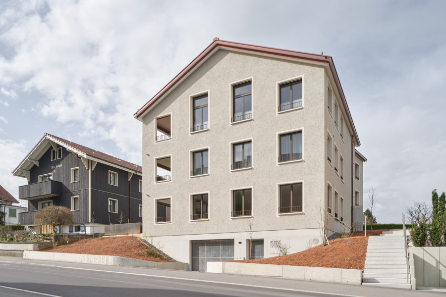 Die Lage im gewachsenen Zentrum verlangt eine zurückhaltende, präzise Setzung, die das Dorfbild stärkt, ohne es zu überzeichnen; der Neubau reagiert darauf mit einer klar proportionierten Strassenkante, einer fein rhythmisieren Lochfassade und gezielten Rücksprüngen, die Einschnitte markieren und gleichzeitig die Adressbildung schärfen. Die Herausforderung, pro Geschoss unterschiedliche Wohnungstypen unterzubringen, wird über eine vertikale Ordnung der Öffnungen gelöst, sodass die Fassade als ruhige, zusammenhängende Fläche wirkt und die innere Vielfalt nicht unruhig nach aussen trägt.