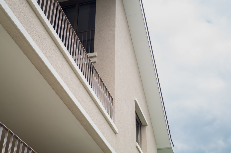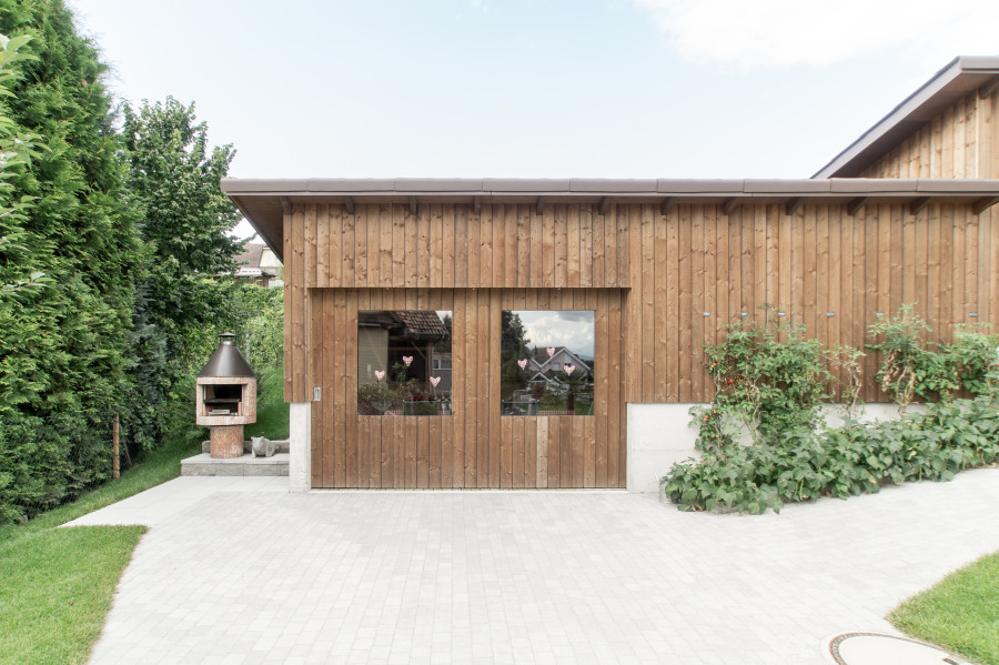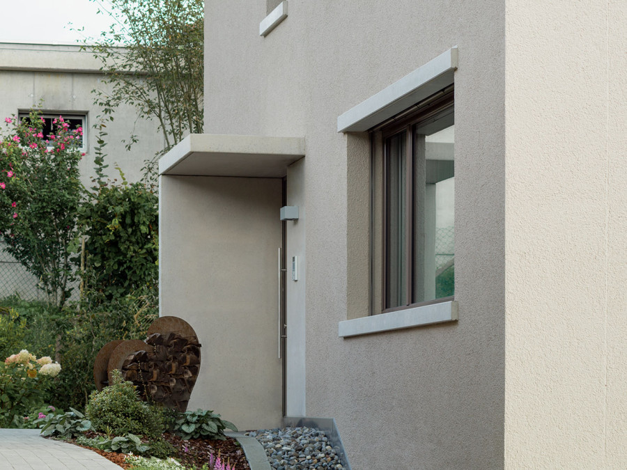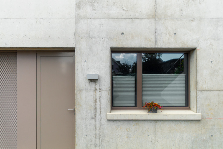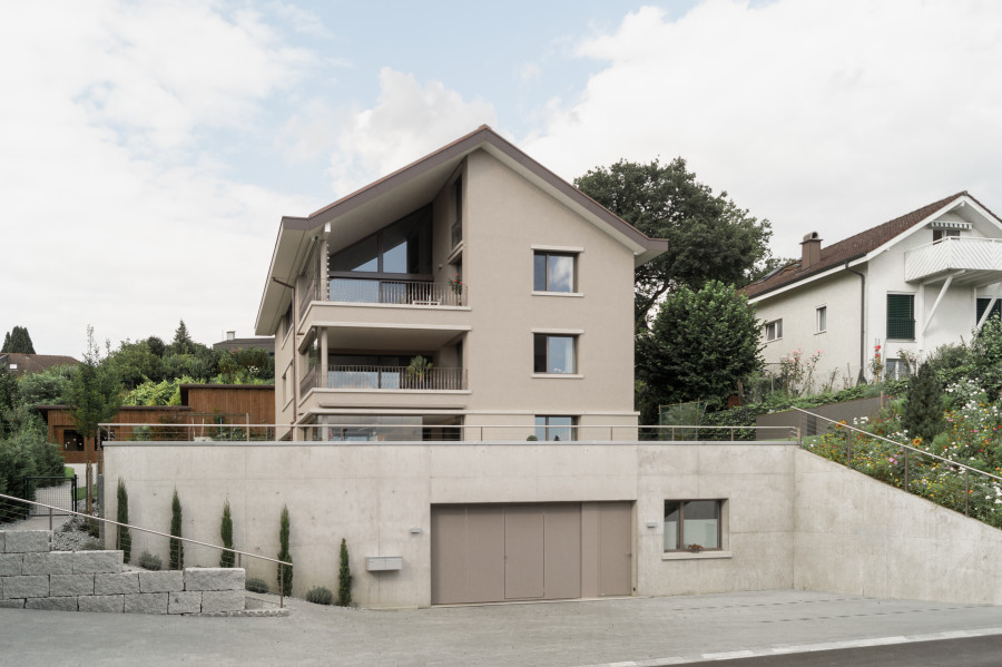 Das Haus ist als robustes Zweischalenmauerwerk konzipiert und setzt auf eine klare, schnörkellose Architektursprache: tragfähige Konstruktion, logisch organisierte Grundrisse und eine zurückhaltende Materialwahl, die sich selbstverständlich in das Quartier einfügt. Die beiden Wohnungen sind so angeordnet, dass kurze Wege, gute Belichtung und ein sinnvoller Bezug zu privaten Aussenbereichen entstehen; die Lochfassade ordnet die Öffnungen präzise und wahrt dabei den ruhigen Gesamteindruck des Baukörpers. Das Satteldach schliesst die Volumetrie ortsüblich ab und unterstreicht den unaufgeregten Charakter des Hauses. In der Summe entsteht ein kleines, dichtes Wohnhaus, das zeigt, wie sich Qualität auch im Einfachen verlässlich umsetzen lässt.