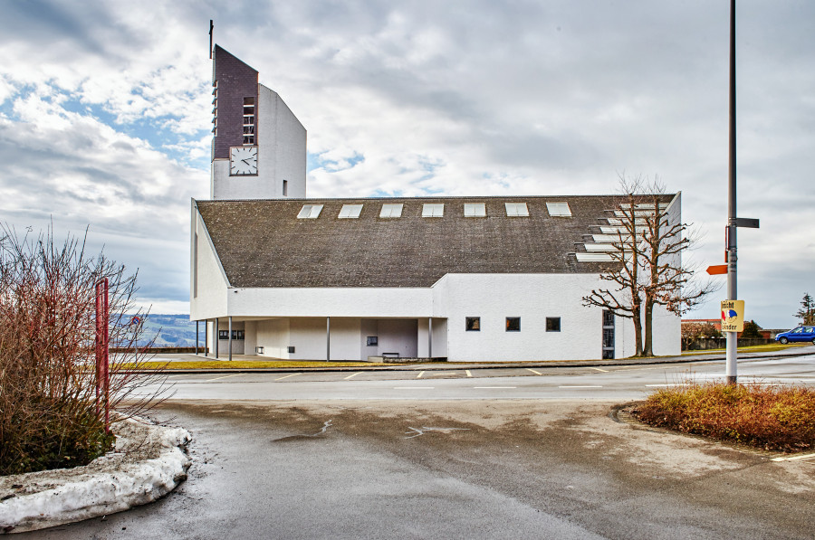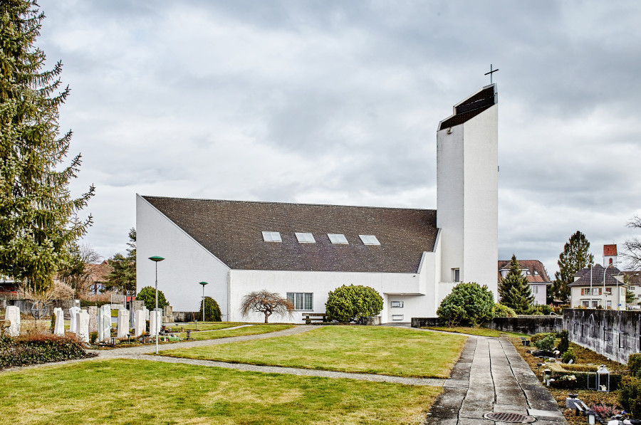 Kirche und Turm formen eine Skulptur: Der sechseckige Baukörper wird von zwei schiefwinkligen Annexen flankiert, welche die Sakristei und einen Kindergartenraum beinhalten. Ein Satteldach vereint die Räume und überdeckt ausserdem einen Vorbereich. Der Einschnitt in das kantige Bauvolumen ist mit schlanken Stahlstützen abgefangen. Der Turm ragt im Südwesten empor. Sein Pultdach ist ebenso wie das Kirchendach innenliegend angeordnet, die verschieden hohen, rau verputzten Wandscheiben ragen somit markant empor. Die Schallarkade ist mit einer Eternitschindelhaube abgesetzt, die über der Uhr ansetzt und mit einem Kreuz endet. Der Baukörper besitzt nur wenigen Öffnungen, sodass die Geometrie klar hervortritt.