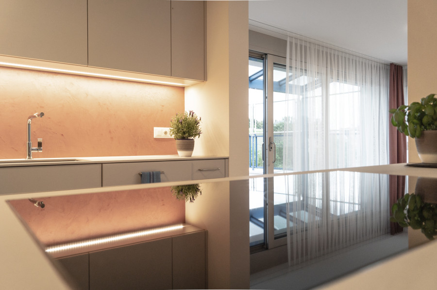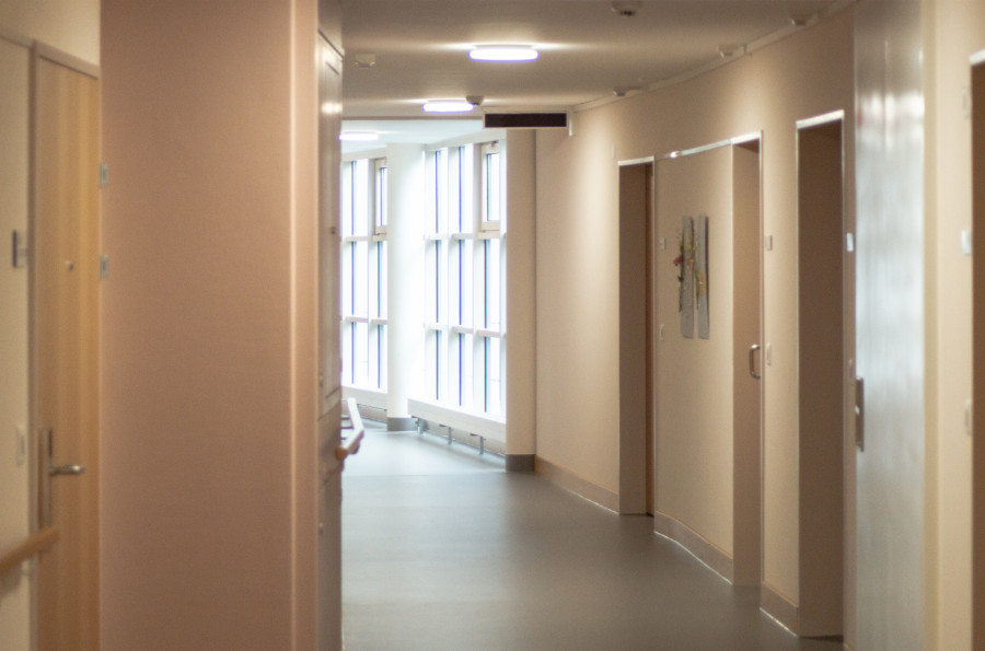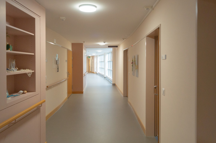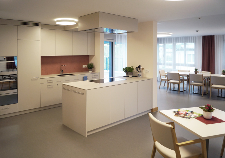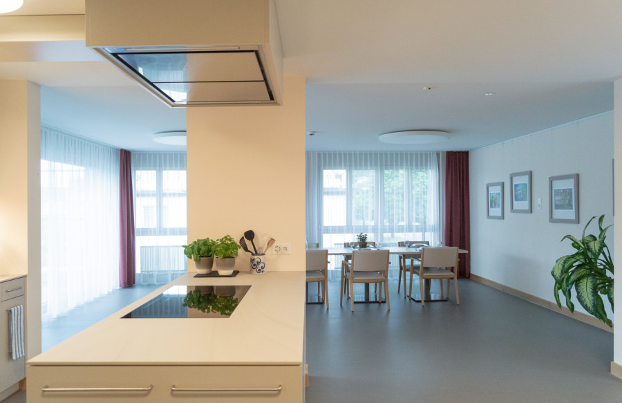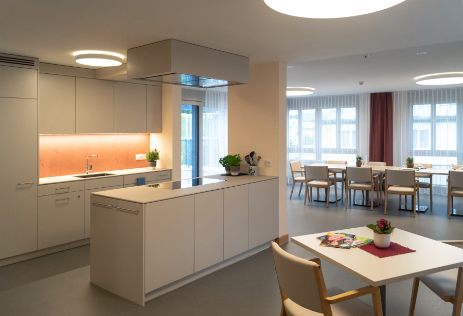 Besonderes Augenmerk lag auf der Umsetzung im laufenden Betrieb der unteren Geschosse: Bauabläufe, Logistik und Kommunikation wurden so organisiert, dass Pflegeprozesse aufrechterhalten werden konnten und die Belastung für Bewohnerinnen und Bewohner möglichst gering blieb. Das Ergebnis ist eine auf die Bedürfnisse der Nutzer zugeschnittene Station, die ohne gestalterische Effekthascherei auskommt und in erster Linie Orientierung, Vertrautheit und funktionale Klarheit bietet.