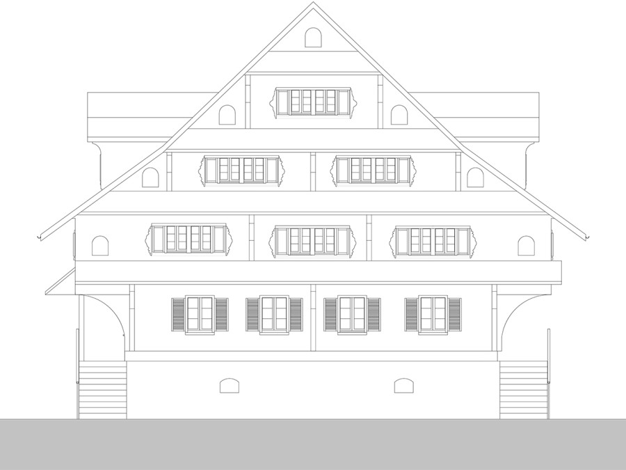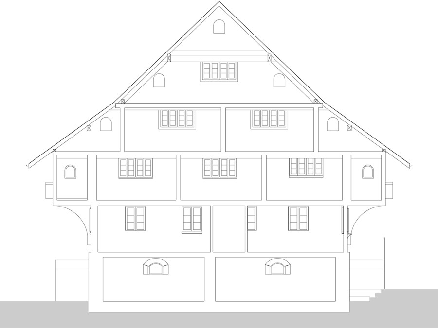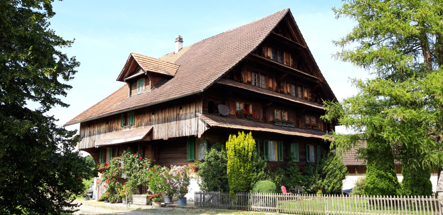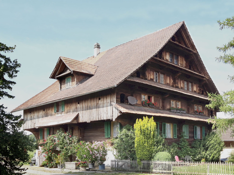 Das mehrgeschossige Bauernhaus mit dunkler, gewachsener Holzfassade und tiefem Dachüberstand wurde in seinem Charakter unangetastet belassen. Am Dach wurden Deckung und Anschlüsse erneuert, Traufen und Ortgänge ausgebessert und einzelne Holzbauteile lokal verstärkt – ohne Änderung der Silhouette. An der Fassade erfolgte der selektive Ersatz fauler Stellen in gleicher Holzart und mit passendem Profil; gefügte Teilstücke und behutsame Ausflickungen machen die Eingriffe nachvollziehbar, ohne ins Auge zu fallen. Fensterläden und Rahmen wurden überarbeitet, Blumenkästen und die Bepflanzung am Sockel blieben erhalten und binden das Haus weiterhin selbstverständlich in den Garten ein. So verbessert die Sanierung Witterungsschutz und Dauerhaftigkeit, während Materialstimmung, Proportion und Details des Bestands sichtbar bleiben.