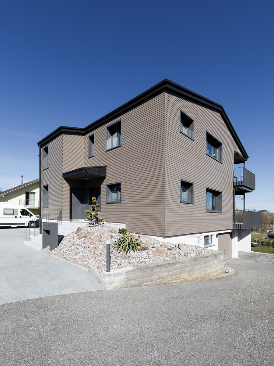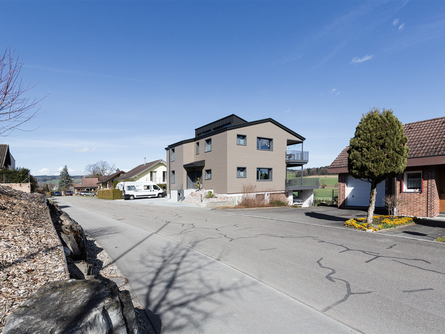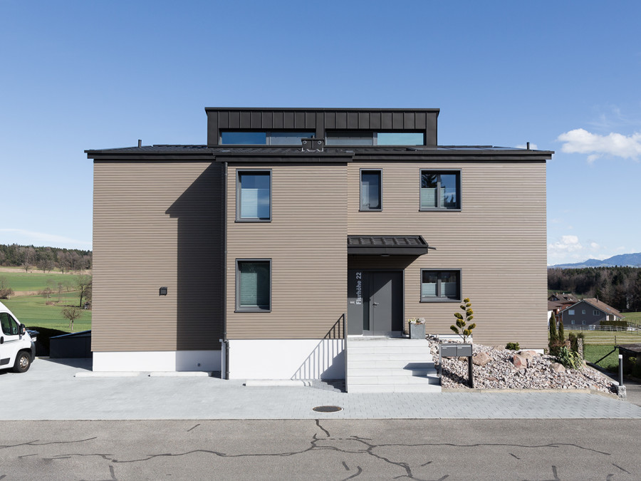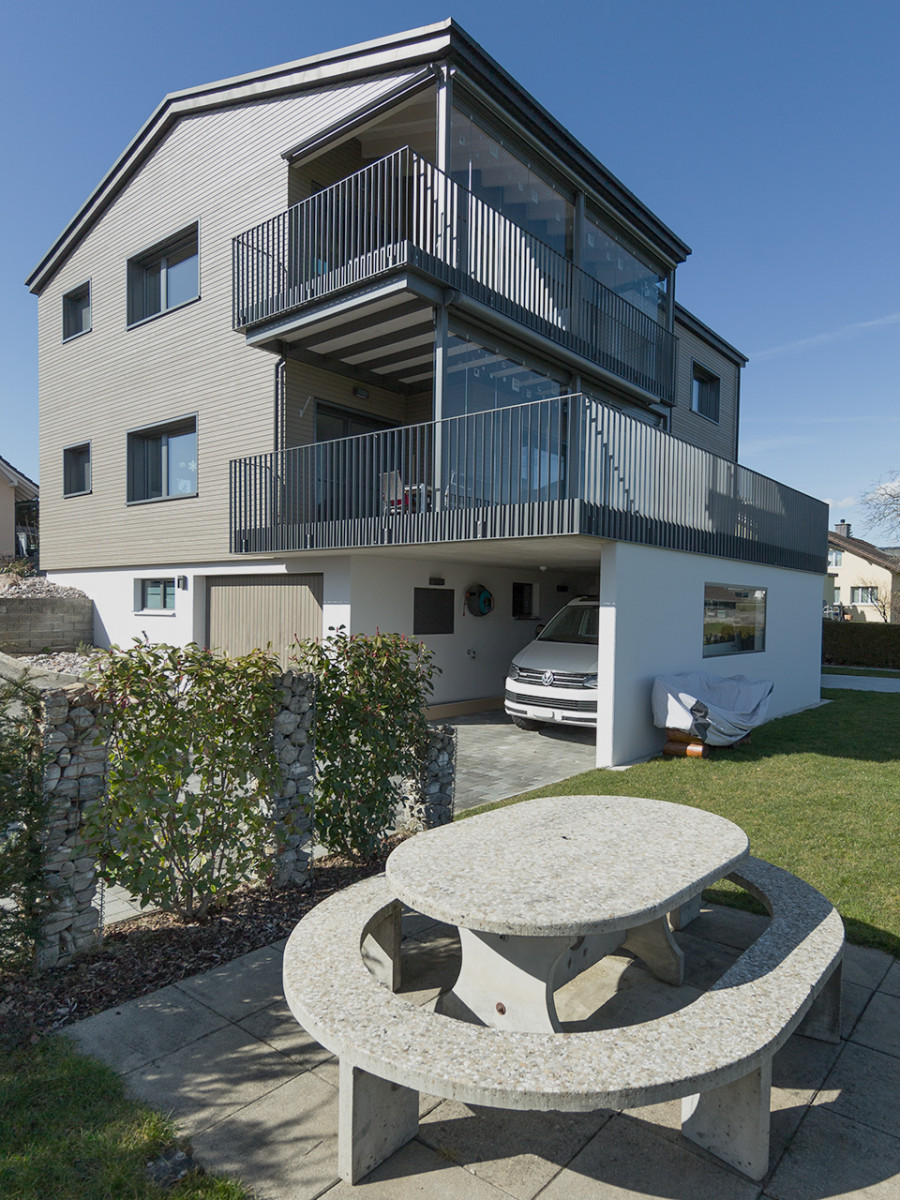 Ein Einfamilienhaus wurde im Zuge eines Generationenwechsels in Holzbauweise aufgestockt und gleichzeitig energetisch saniert. Die Erweiterung ist so in das Bestandsvolumen integriert, dass das Gebäude heute wie aus einem Guss wirkt; grosszügige Aussenräume und eine kostenbewusste Umsetzung standen im Vordergrund.