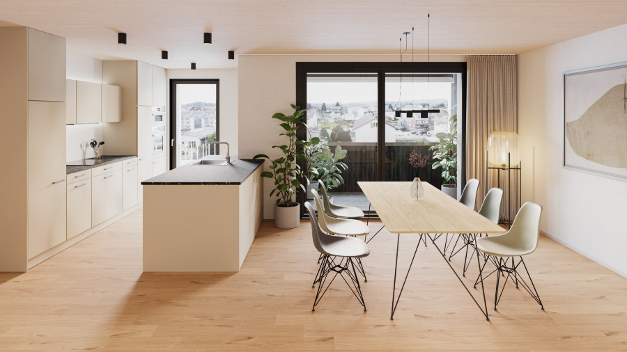 Der Freiraum ist klar gefasst: Der grosszügige, ostseitige Hof dient als halböffentliche Begegnungszone. Durch die Anbindung an eine bestehende Einstellhalle bleibt der Aussenraum weitgehend vom motorisierten Verkehr frei; ein feinmaschiges Wegenetz sorgt dennoch für gute Erreichbarkeit zu Fuss und mit dem Velo. So entsteht ein ruhiges, alltagstaugliches Wohnumfeld trotz der Lage an der Hauptachse.