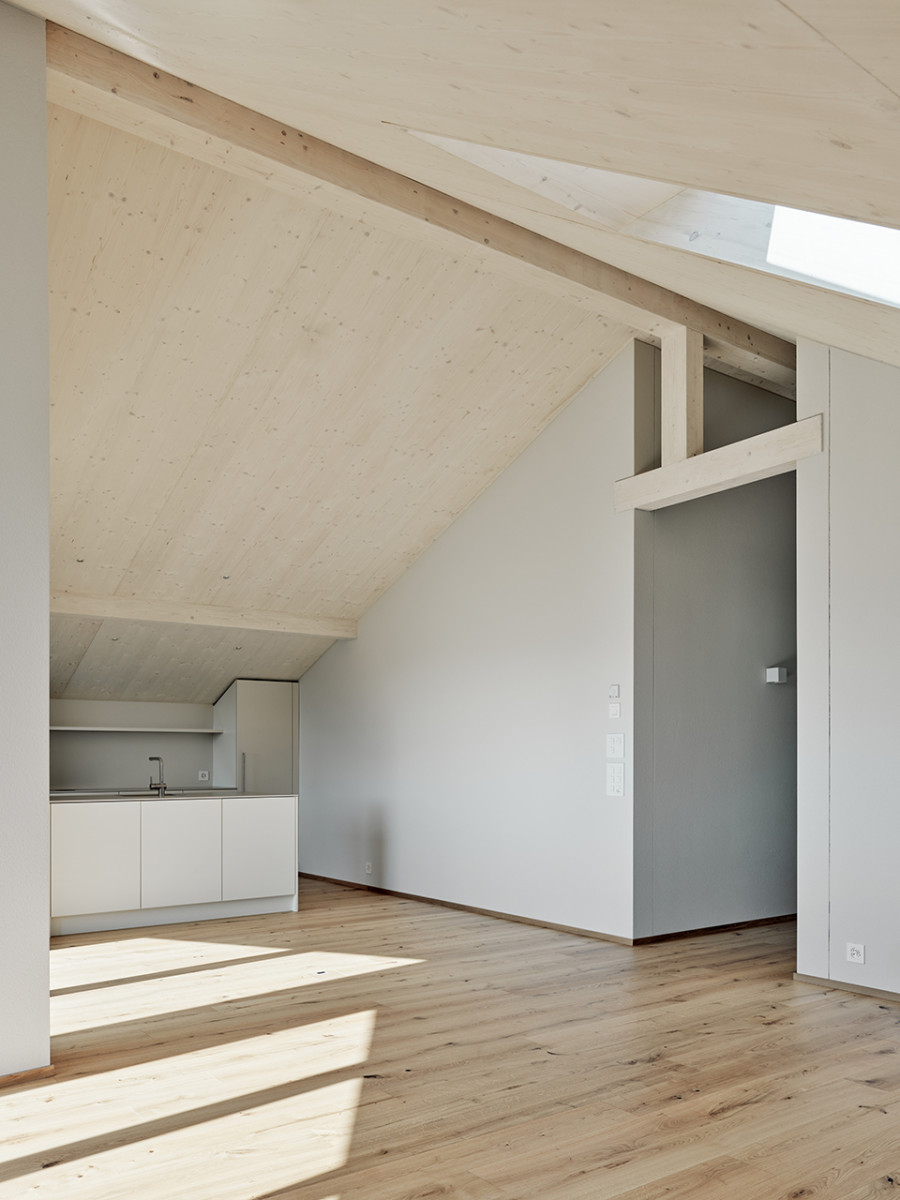 Die Grundrisse sind klar und alltagstauglich aufgebaut: kurze Wege, übersichtliche Räume, robuste Küchen- und Nasszellenlösungen sowie ausreichend Stauraum. Die Lukarnen bringen zusätzliches Licht in die Dachzone und schaffen angenehme Raumhöhen; die Aussicht auf Landwirtschaftsflächen und Bergpanorama ist Teil der Wohnqualität und wird durch die Orientierung der Aufenthaltsräume gezielt aufgenommen.