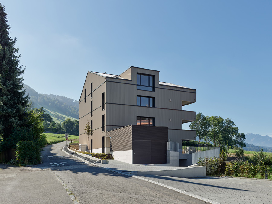 Das Haus steht in einer naturnahen, gut erschlossenen Situation zwischen Wohnquartier und Naherholung; es ergänzt die bestehende Struktur, ohne sich in den Vordergrund zu spielen, und hält mit seiner ruhigen Fassadengliederung Mass und Nachbarschaft. Jede der vier Wohnungen ist grosszügig geschnitten, hell belichtet und verfügt über einen gut nutzbaren Aussenbereich, der den Wohnraum funktional erweitert.
