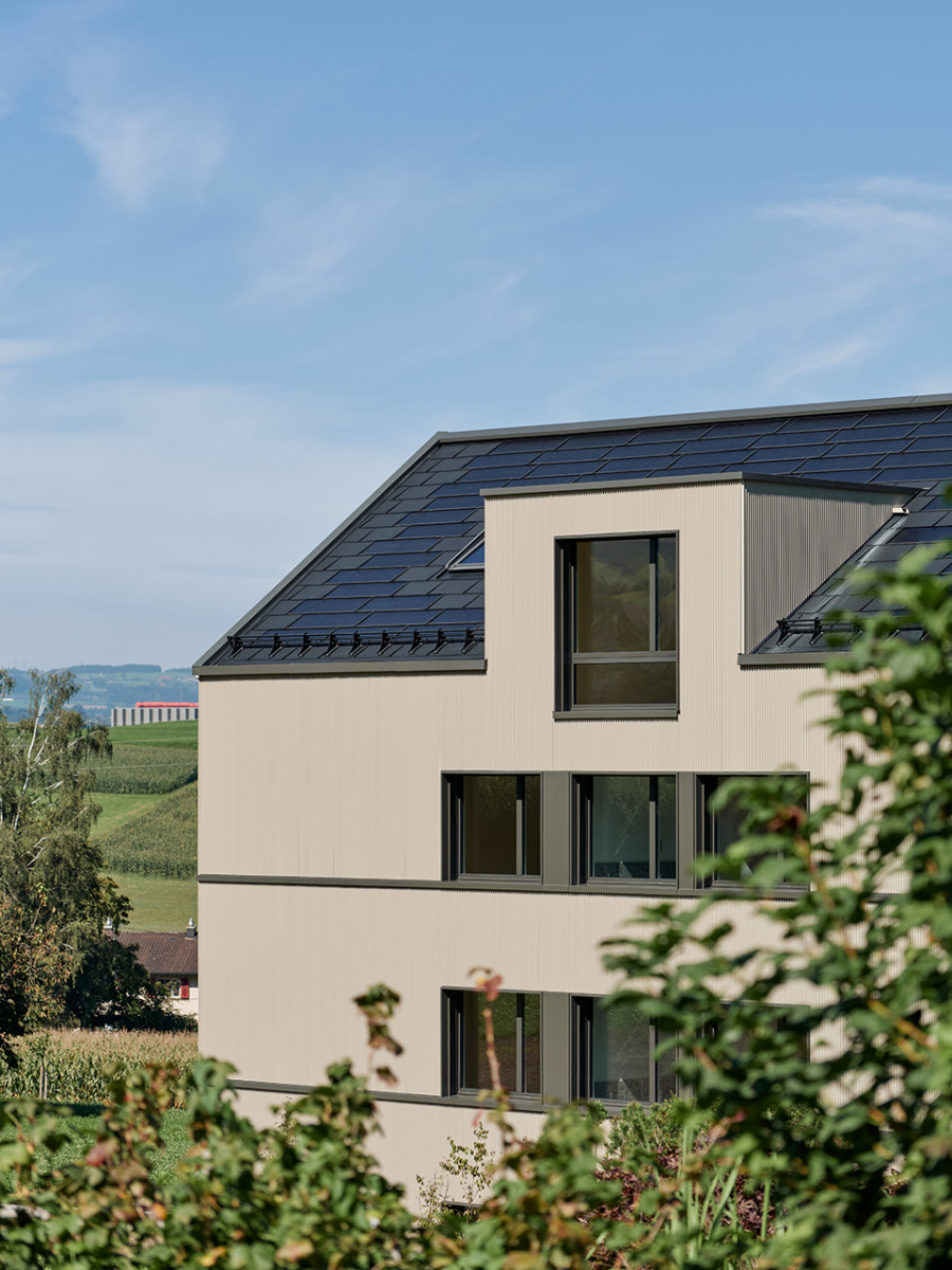 Ein kompaktes Mehrfamilienhaus mit vier grosszügigen Mietwohnungen schliesst den Siedlungsrand von Root zur Landschaft ab. Lukarnen prägen die Dachsilhouette, Balkone und Sitzplätze öffnen die Wohnungen zum Grünraum; die Lage bietet Weitblicke bis zum Pilatus. Grundrisse und Erschliessung sind einfach organisiert und auf den Alltag ausgelegt.
