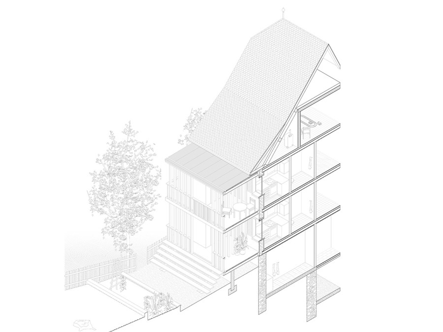Der Entwurf setzt auf Weiterbauen statt Ersetzen: Der Altbau bleibt Hauptdarsteller, neue Schichten werden bewusst als zeitgenössische Ergänzungen lesbar gehalten. Zwei Wohneinheiten und ein Atelier werden innerhalb der bestehenden Ordnung angeordnet; Balkon und Dachbox schaffen aussen wie innen präzise Mehrwerte, ohne die Proportionen zu kippen.