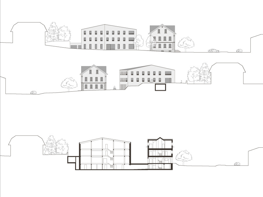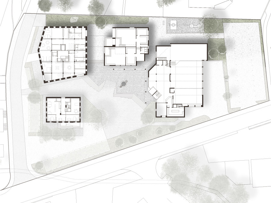 Im Aussenraum werden die vorhandenen „Unorte“ aufgelöst und durch gut lesbare Teilräume ersetzt: Hof, Begegnungszone, Strassenraum und ein erhöhtes Spielband für die Kita. Die Erschliessung ist nach Nutzungen differenziert, ohne das Ensemble zu zerschneiden – Verwaltung über die Begegnungszone, Betreuungs-, Wohn- und Büroflächen vom Strassenraum her. So entsteht ein öffentlicher Ort, der den Alltag aufnimmt und Orientierung schafft.