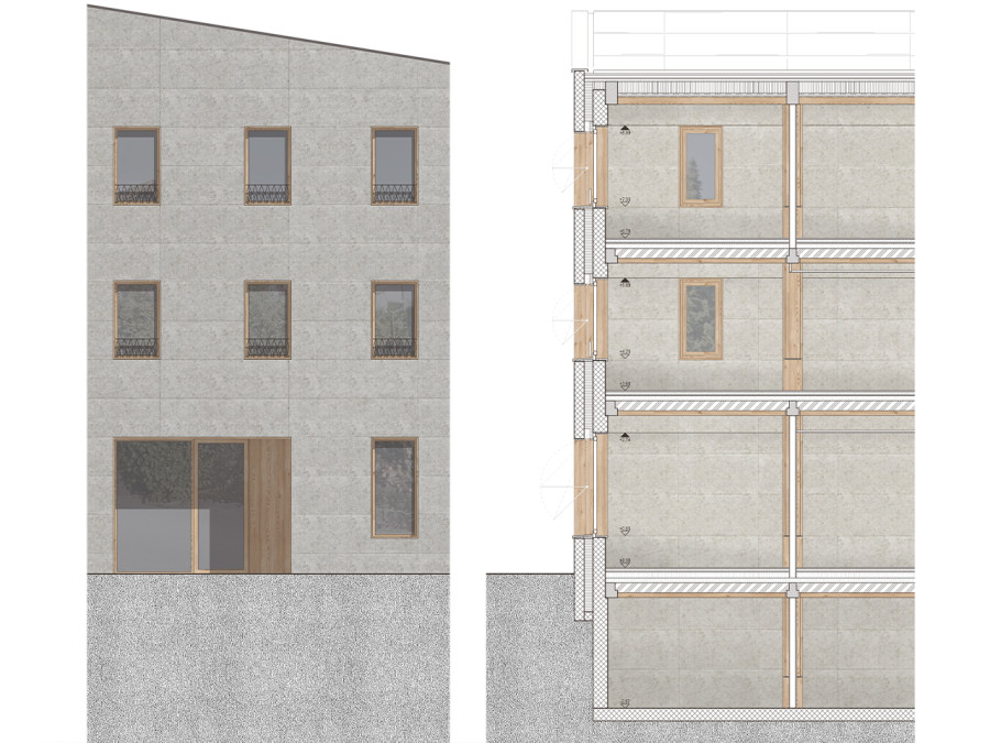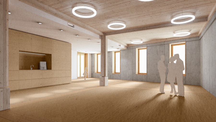 Die Materialisierung verankert das Projekt im lokalen Kontext. Aussen sorgt eine robuste, langlebige Betonschicht – in Körnung und Anmutung mit Bezug zum nahegelegenen Kieswerk – für speicherfähige Masse im Sommer wie im Winter; innen übernimmt ein Holzbau die tragenden Aufgaben und reguliert die Raumfeuchte. Die Oberflächen bleiben in ihrer natürlichen Farbigkeit sichtbar, Leitungen werden wo möglich offen geführt: Das Konzept des veredelten Rohbaus macht Konstruktion und Gebrauch ablesbar.