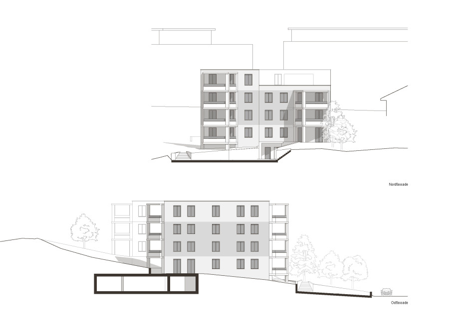 Wettbewerbsbeitrag für ein kompaktes Mehrfamilienhaus am Rand der Wohnzone in Hochdorf: vorgesehen ist ein Wohnungsmix von 2.5–4.5 Zimmern, eine unterirdische Parkierung und ein Entwurf, der das steigende Terrain nutzt, funktional klar bleibt und mit möglichst einfachen Mitteln eine robuste, nachhaltige Architektur formuliert.